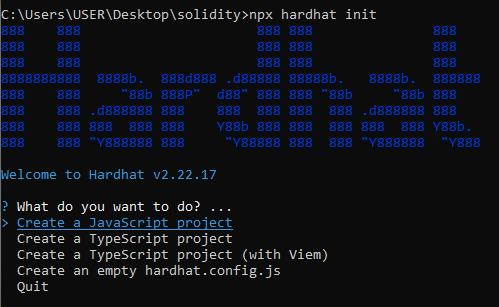 Here, you can create either a JavaScript or a TypeScript project to start creating, testing, and deploying smart contracts.